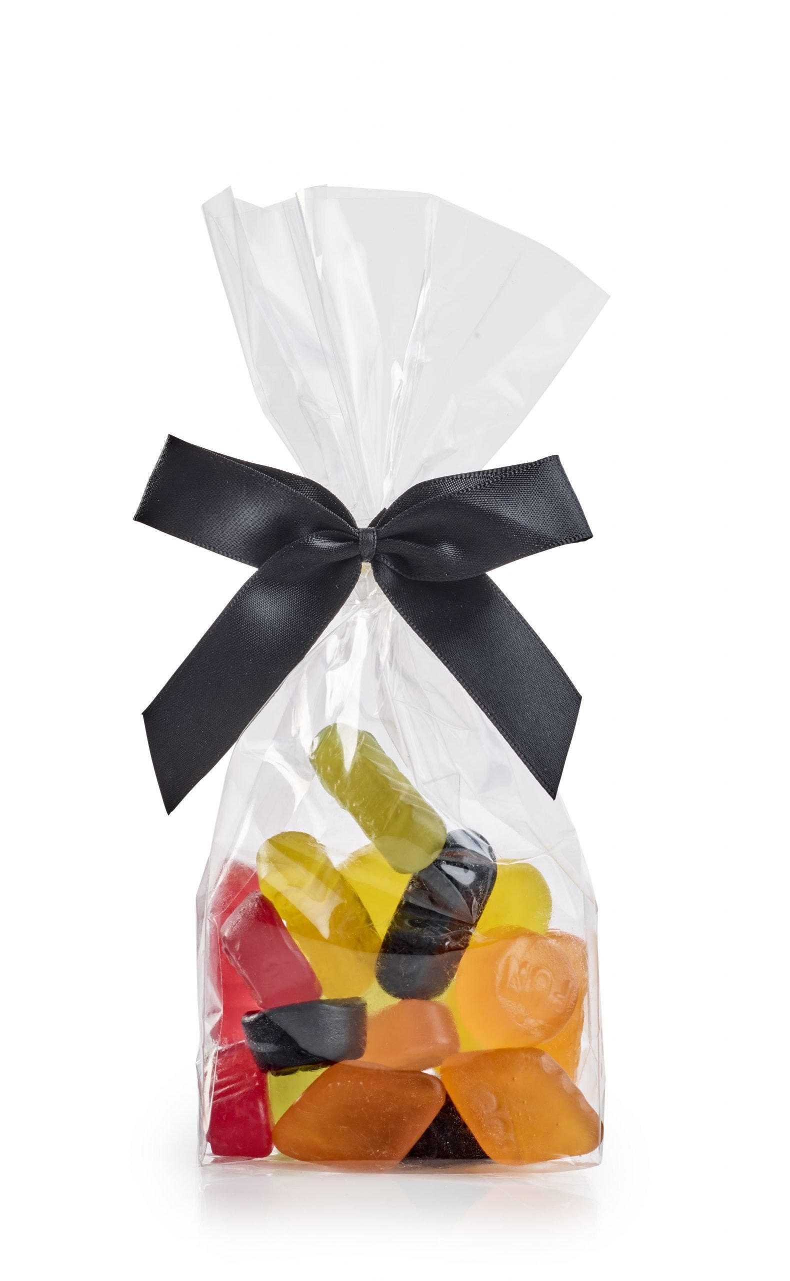 Cellofanposer m/ sort sløjfe, Engelsk Vingummi, 90 g.