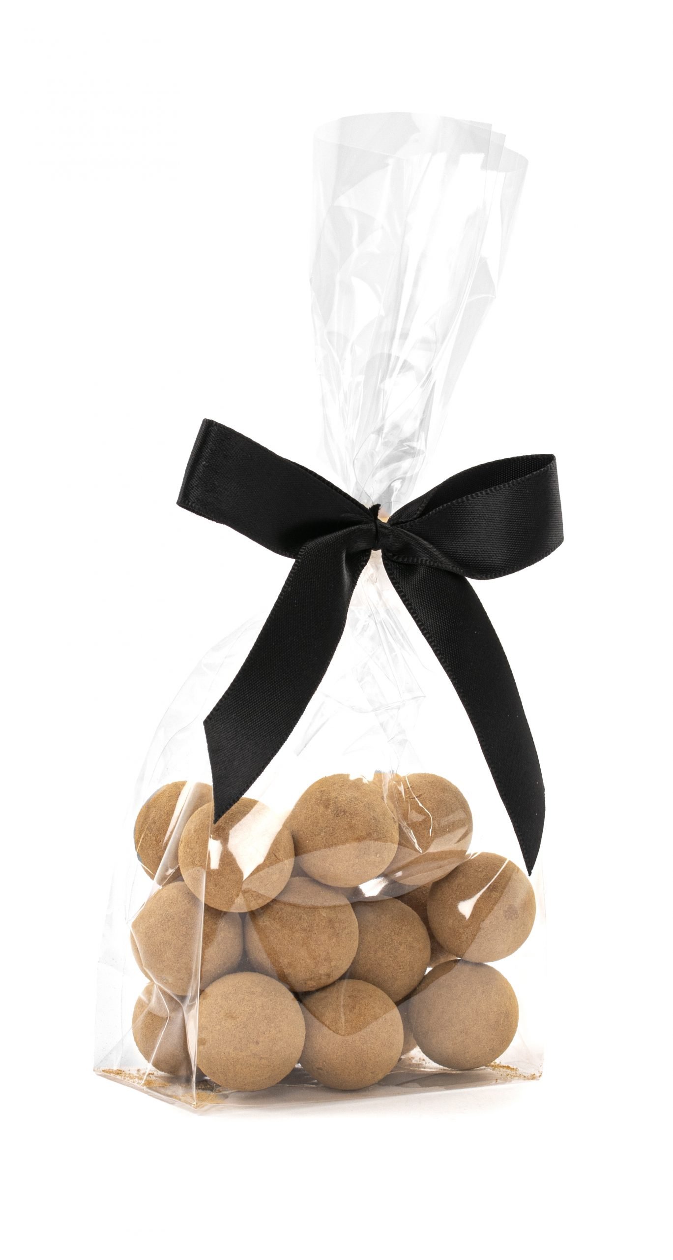 Cellofanposer m/ sort sløjfe, Lakridskugler chokolade & lakridspulver, 90 g.