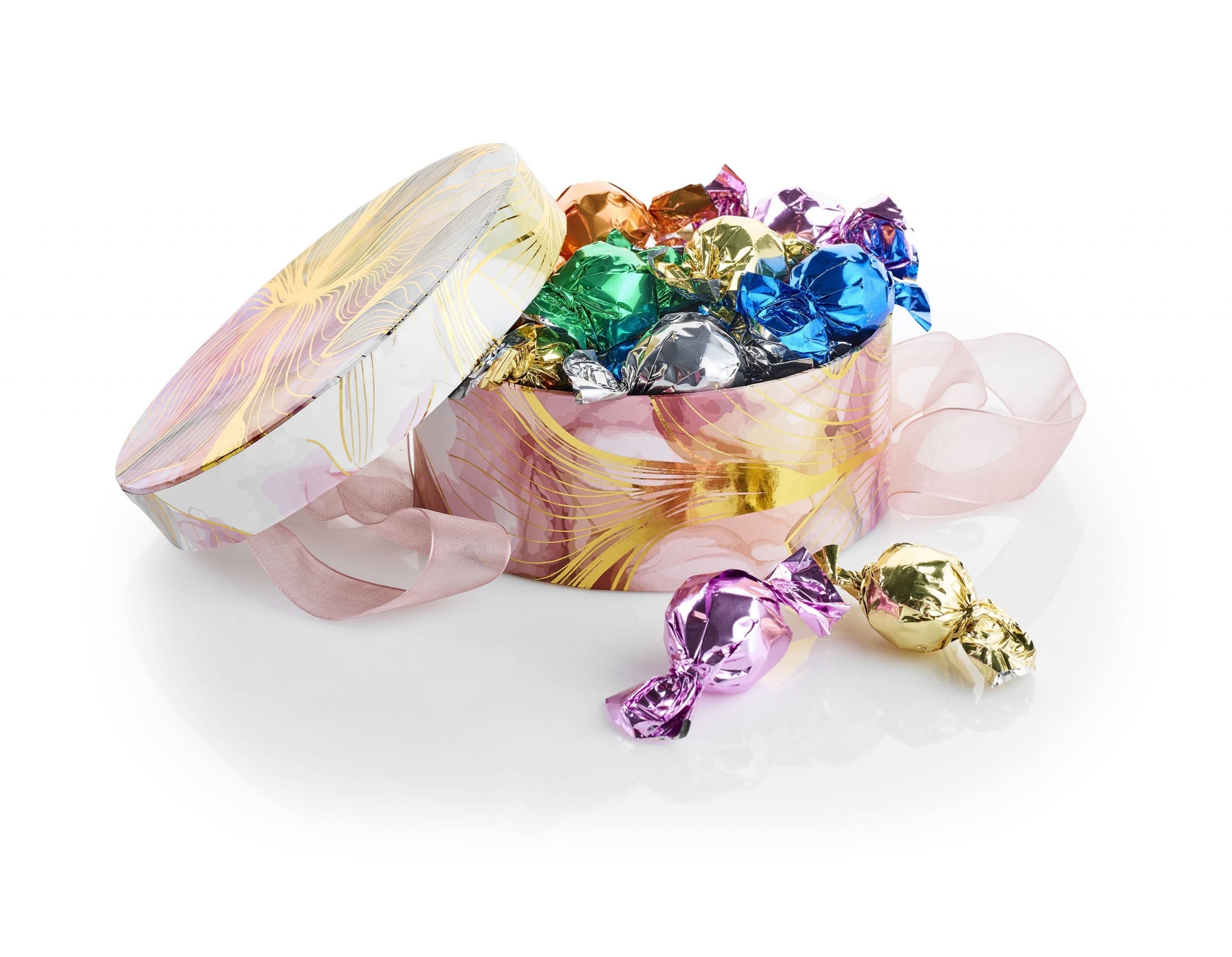Rund Hatteæske Akvarel Guld, Mixede Chokoladekugler 300 g.