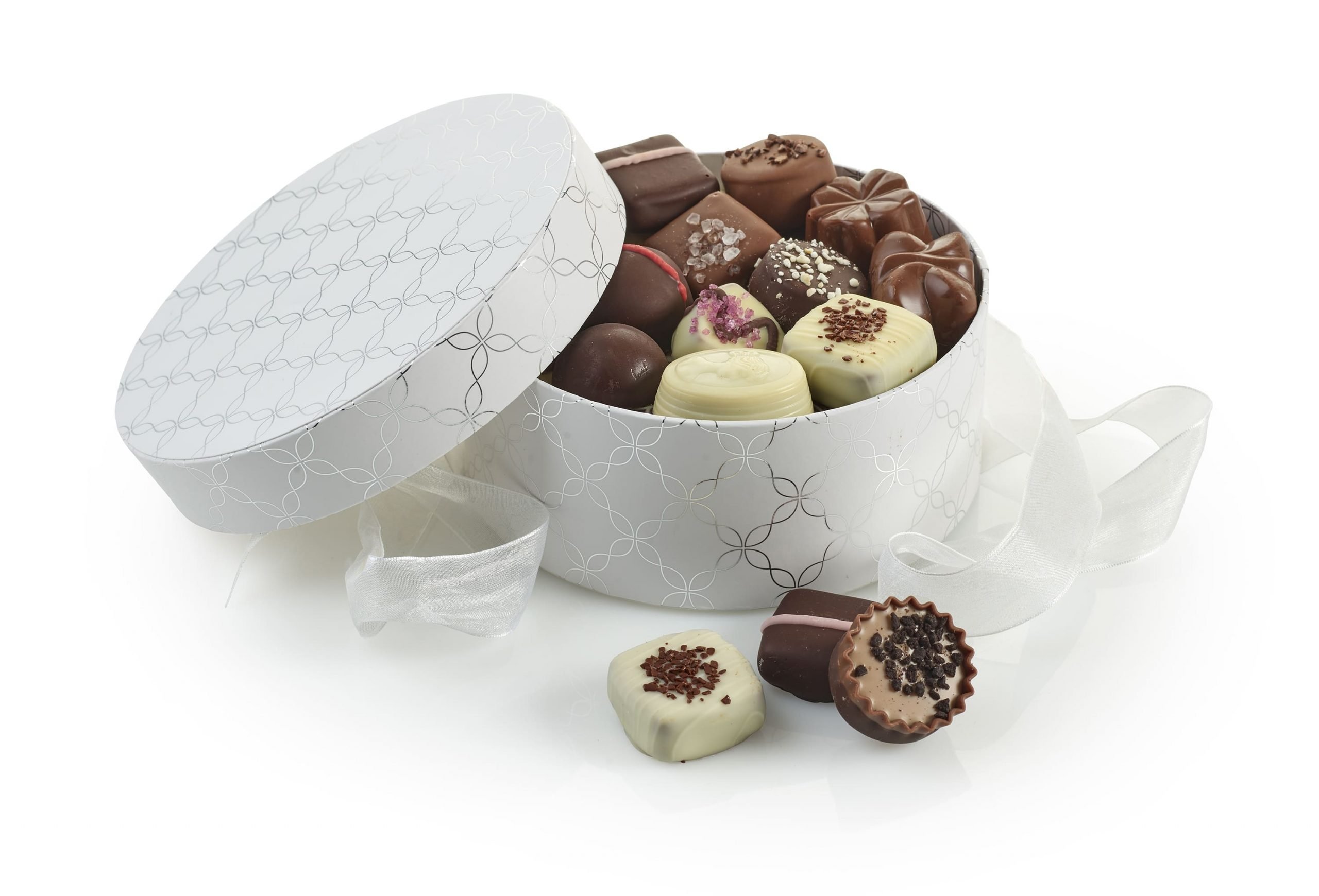 Rund Hatteæske Hvid/Sølv Luksuschokolade 500 g.