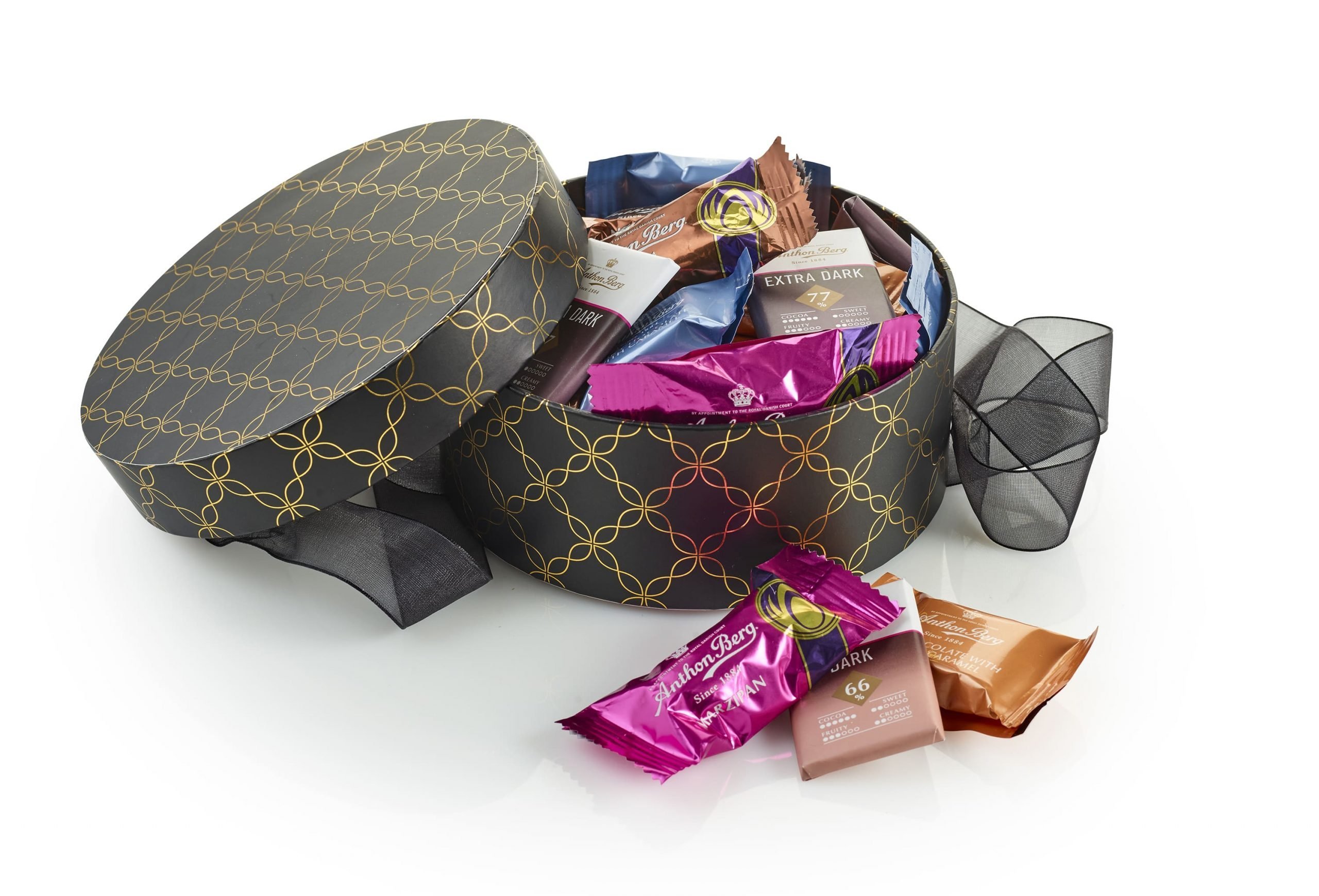 Rund Hatteæske Sort/Guld, Anthon Berg Mix 250 g.