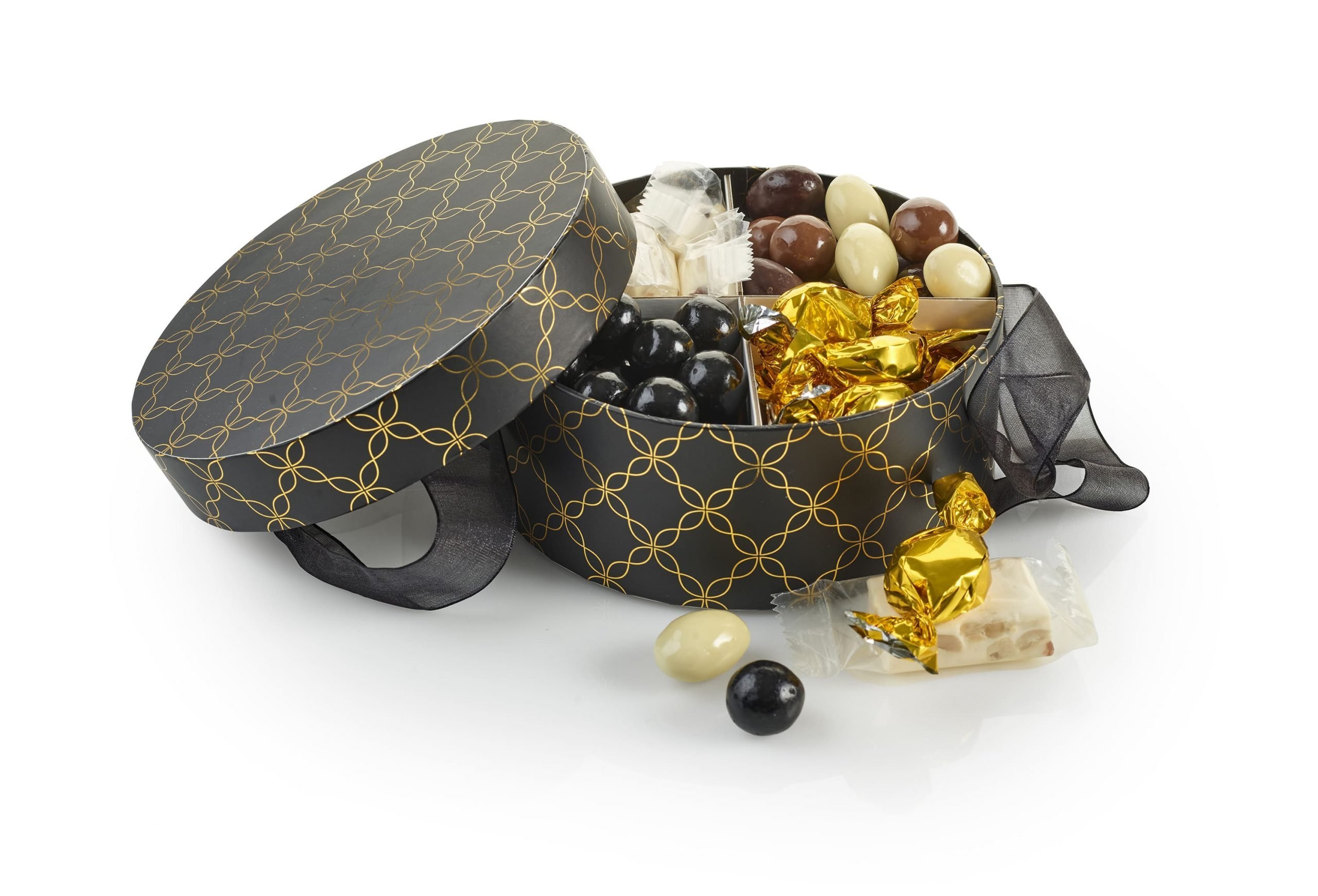 Rund Hatteæske, Sort/Guld, Familieæske 400 g.