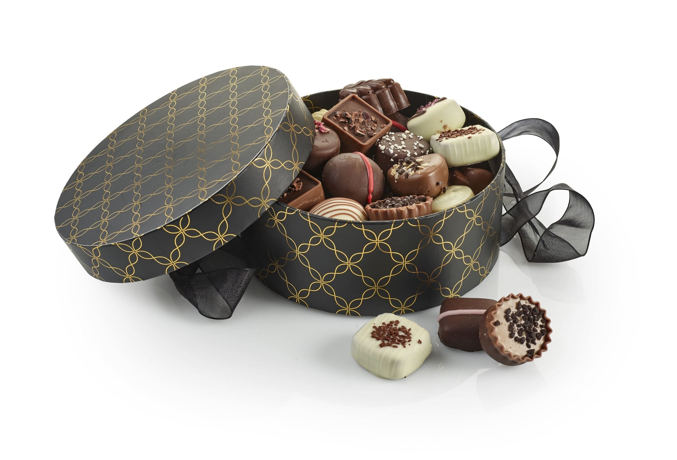 Rund Hatteæske, Sort/Guld, Luksuschokolade 500 g.