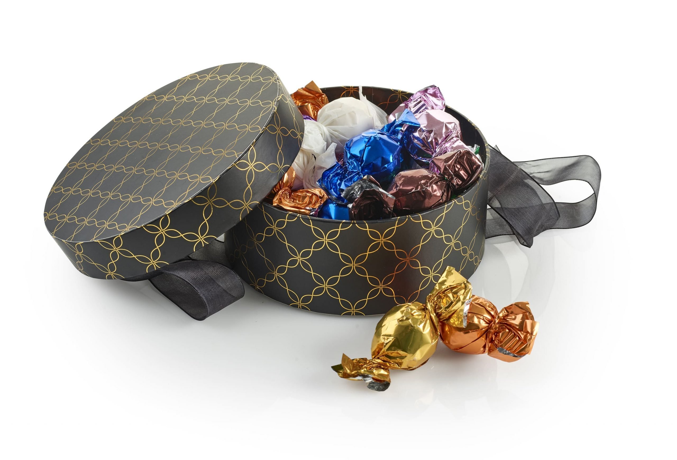 Rund Hatteæske Sort/Guld, Mixede Chokoladekugler 300 g.