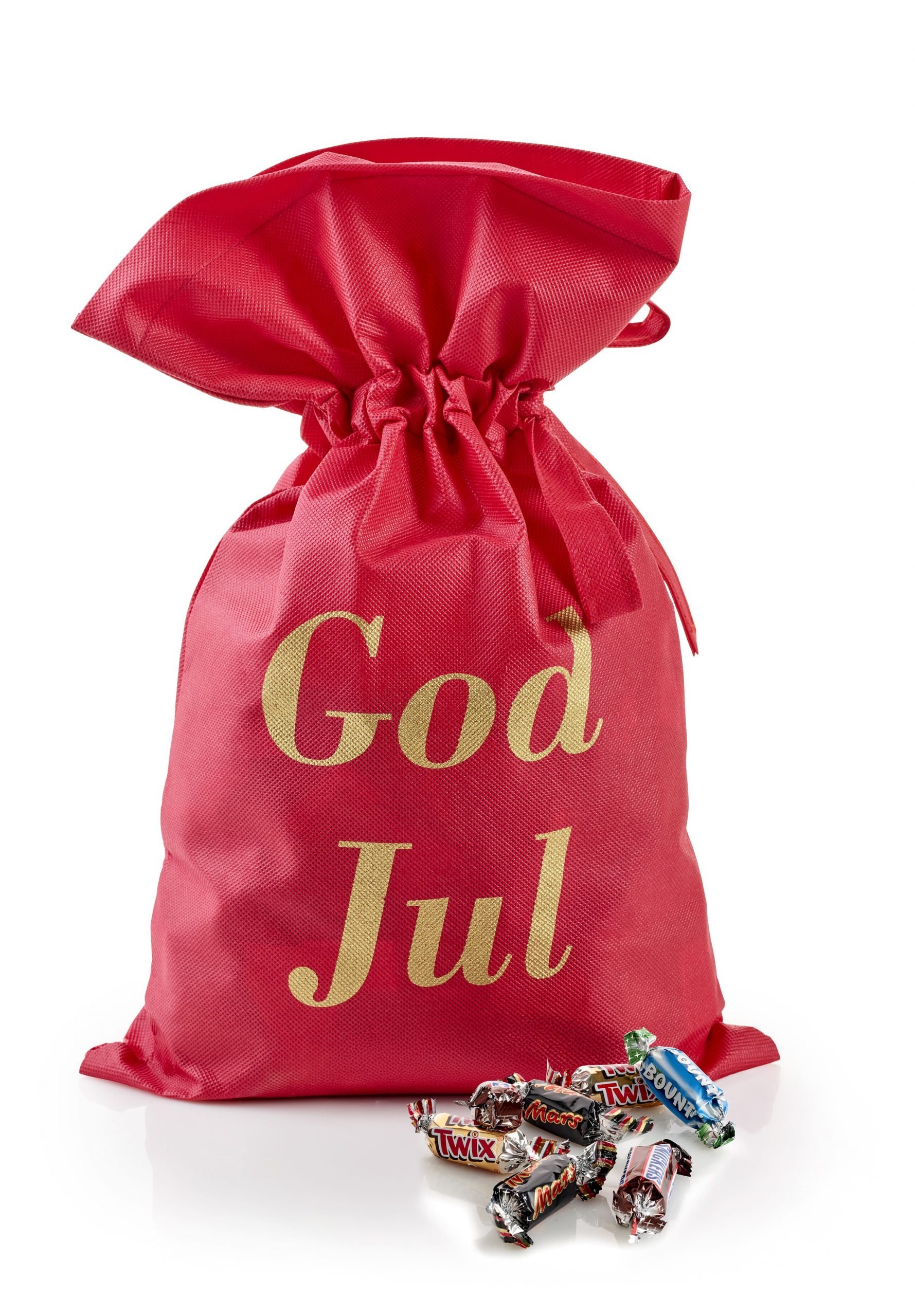 Rød stofpose m/tryk God Jul, Mars Miniaturemix, 2900 g.