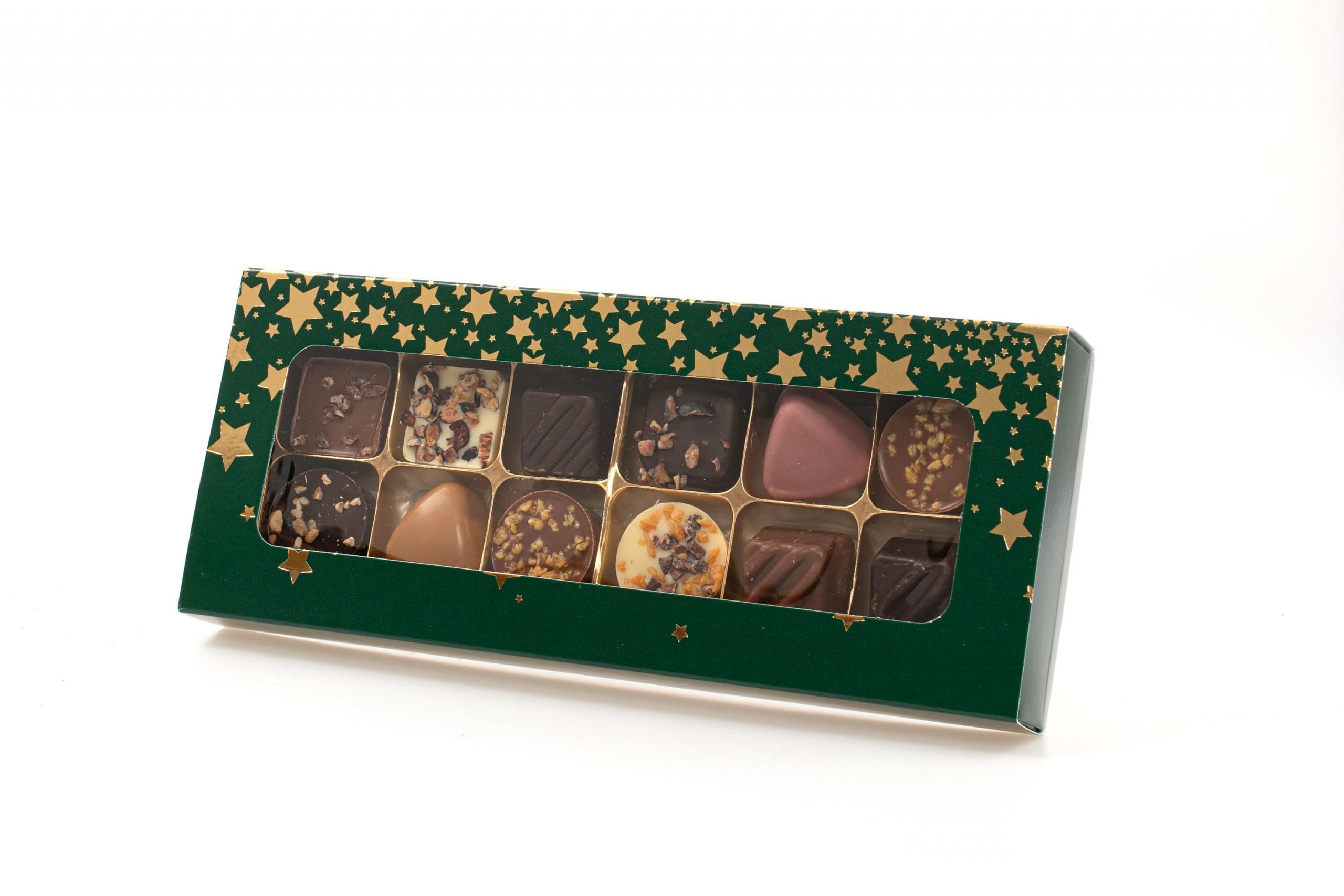 Grøn/Guld Stjerner æske, 12 stk. Luksus chokolade, 120 g.