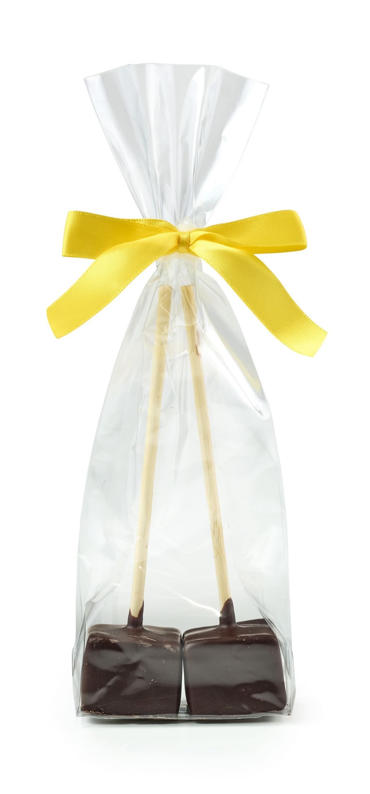 Cellofanpose m/ Gul sløjfe, 2 stk. Mørk rørepinde, 66 g.