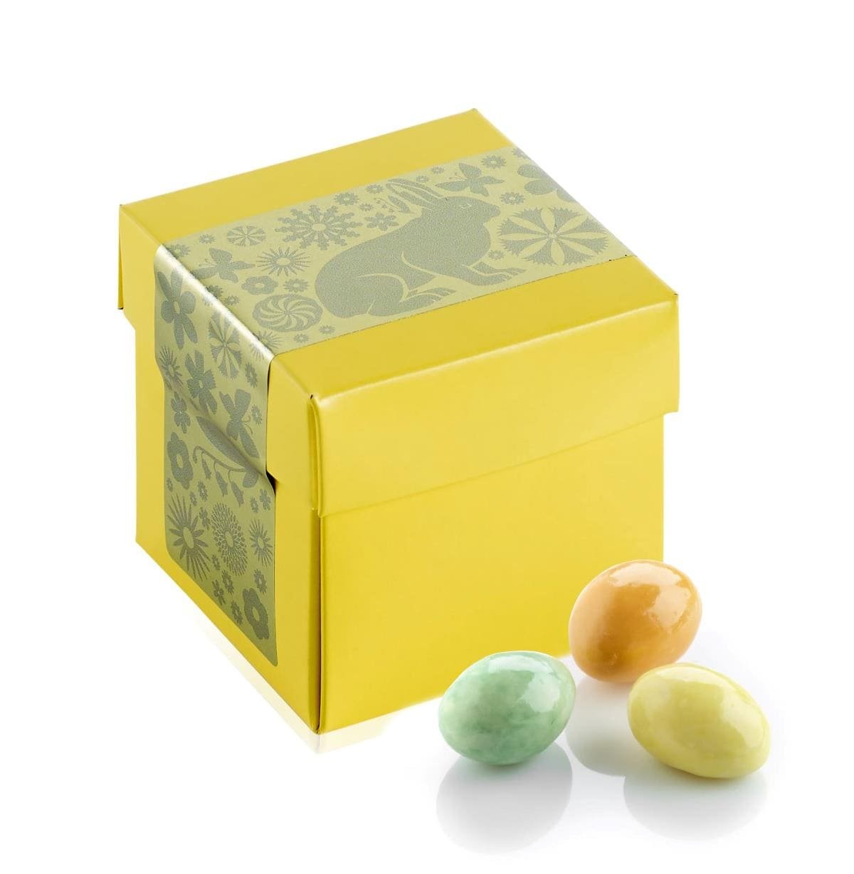 Gul Surpricebox m/påskelabel, Påskemandler, 90 g.