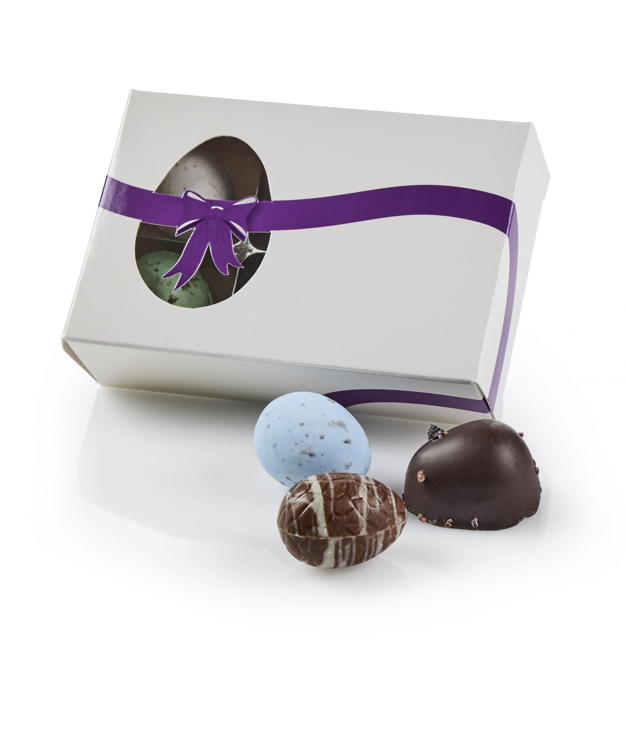 Påskeæske, Lilla sløjfe 6 stk - Marcipanæg, Luksusæg & Belgiske fugleæg 60 g.