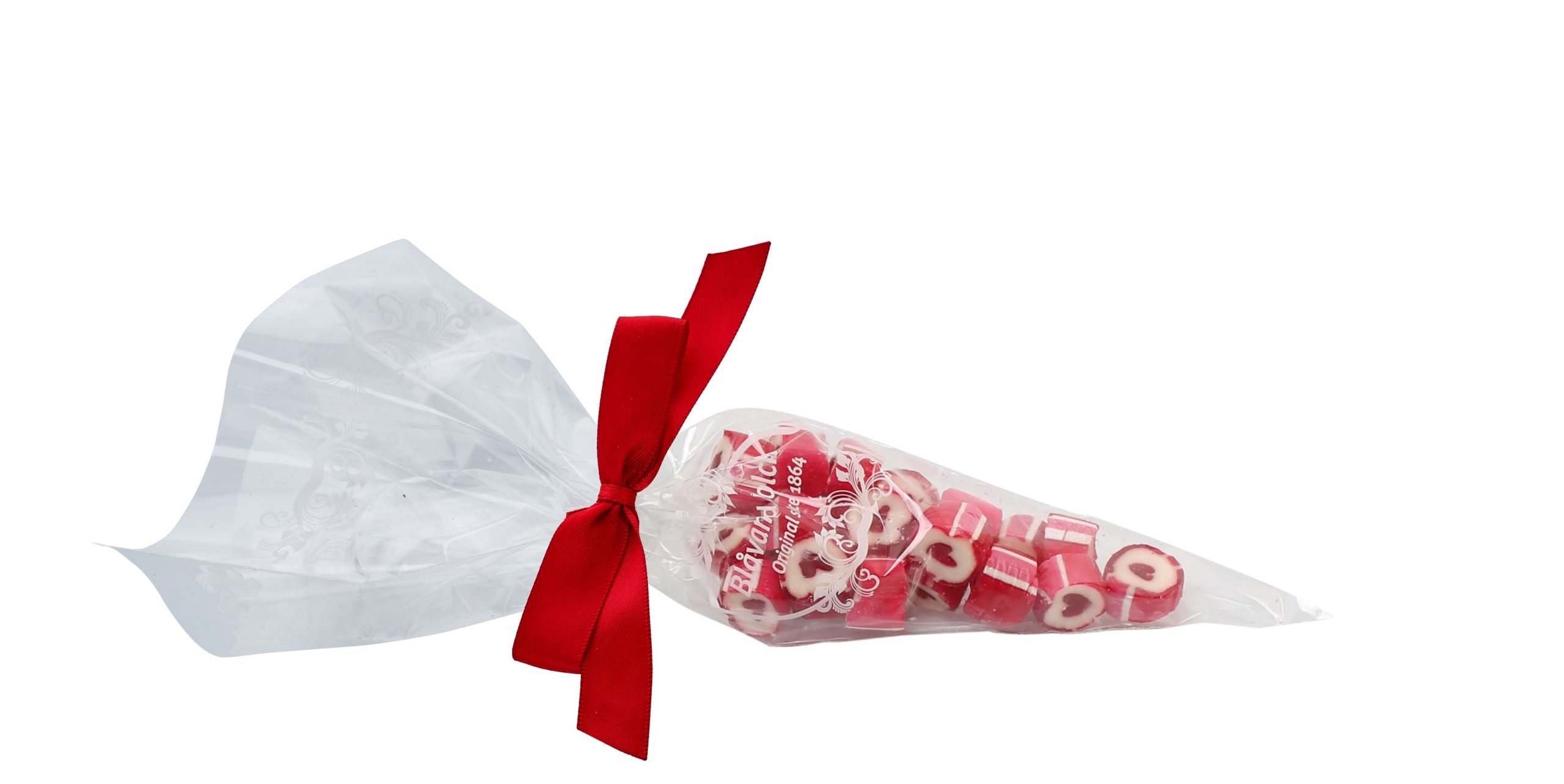 Hjerte rox i spidspose m/rød silkesløjfe, 100 g.